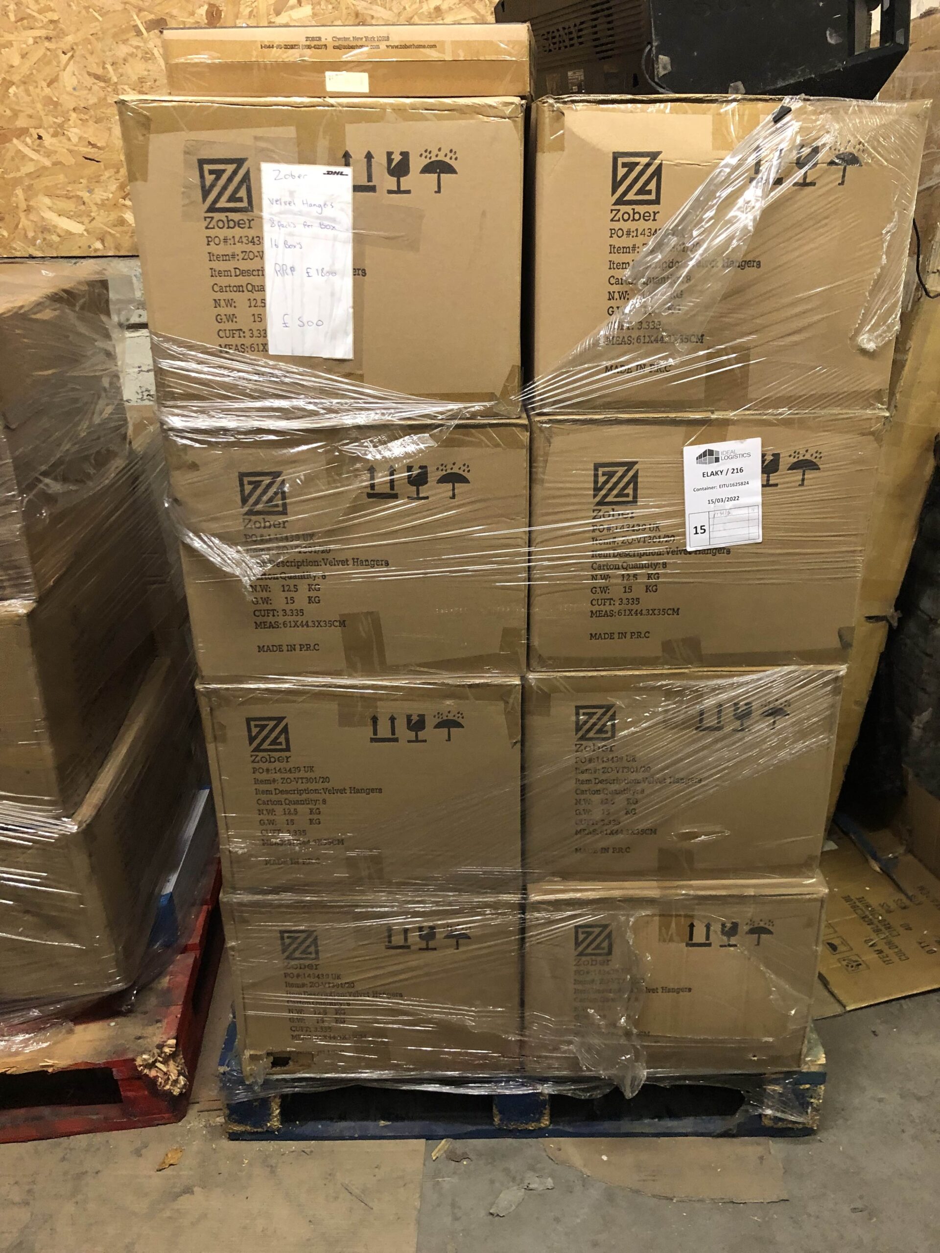 This pallet contains 16 boxes with 8 units per box of Zober black velvet clothes hangers (2560 hangers in total), the pallet contents has an overall on average RRP of €1800 on websites such as Amazon and Ebay. At our competitive price of €500 this pallet is perfect for resale at wholesale or individual level, with a great scope for profit.
